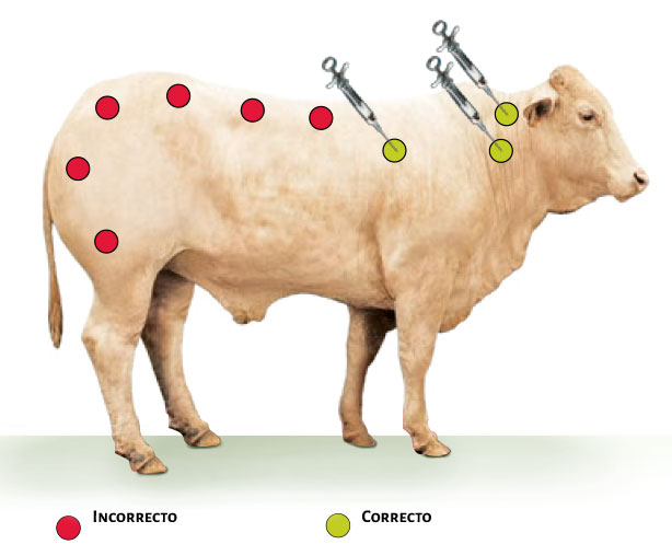 - Nunca debe inyectarse en los cuartos traseros, ni en las piernas ni en el lomo del animal, por cuanto son las áreas de mayor valor de la canal. Las lesiones en estos sitios ocasionan decomisos y pérdidas económicas al productor y crean una mala imagen de su ganadería.