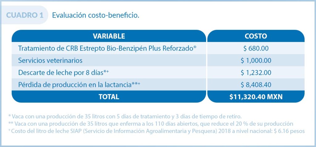 El costo por animal enfermo es de $ 2,912 pesos, sin tomar en cuenta la pérdida de producción de leche por el CRB en la lactancia.