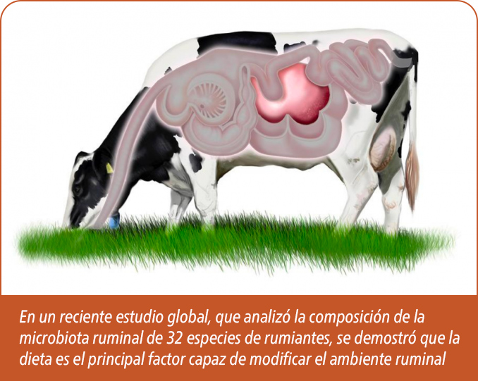La microbiota ruminal puede ser considerada como un complejo ecosistema que contiene distintos microorganismos especializados (bacterias, hongos, protozoos, arqueas) para diferentes funciones. En un reciente estudio global –realizado en 35 países de los 5 continentes– que analizó la composición de la microbiota ruminal de 32 especies de rumiantes; se demostró que por encima de la especie animal y la ubicación geográfica, la dieta es el factor principal capaz de modificar el ambiente ruminal (Henderson et al., 2015).