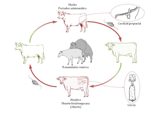 La mayoría de las vacas infectadas eliminarán la infección en un periodo aproximado de 90 días, tiempo que permanecerán como portadoras, después adquieren cierta resistencia al parásito aunque ésta es de corta duración, así que pueden reinfectarse en la siguiente época reproductiva. El macho bovino es considerado el principal transmisor de la enfermedad ya que actúa como un portador sano, pudiendo mantener esa condición por más de tres años, o incluso de por vida. El protozoario se localiza en los pliegues del prepucio del toro, conocidos como criptas peneanas, sobre todo a nivel del fórnix, y puede permanecer viable en el semen congelado.