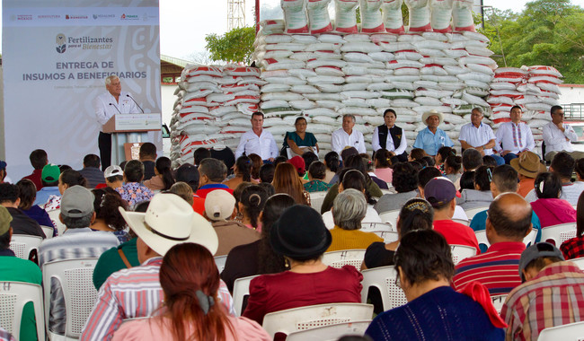 El secretario de Agricultura y Desarrollo Rural, Víctor Villalobos Arámbula, informó que se entregarán este año 11 mil 939 toneladas del insumo, para cubrir una superficie de 39 mil 939 hectáreas de cacao, frijol, maíz y milpa.