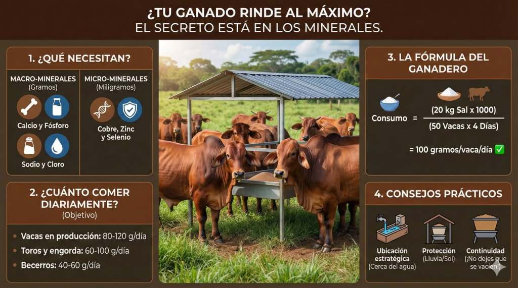 A veces nos preocupamos mucho por el pasto y la proteína, pero olvidamos el «motor» invisible del ganado: los minerales. Una deficiencia mineral silenciosa puede costarte celos perdidos, terneros débiles y menos kilos al destete.
