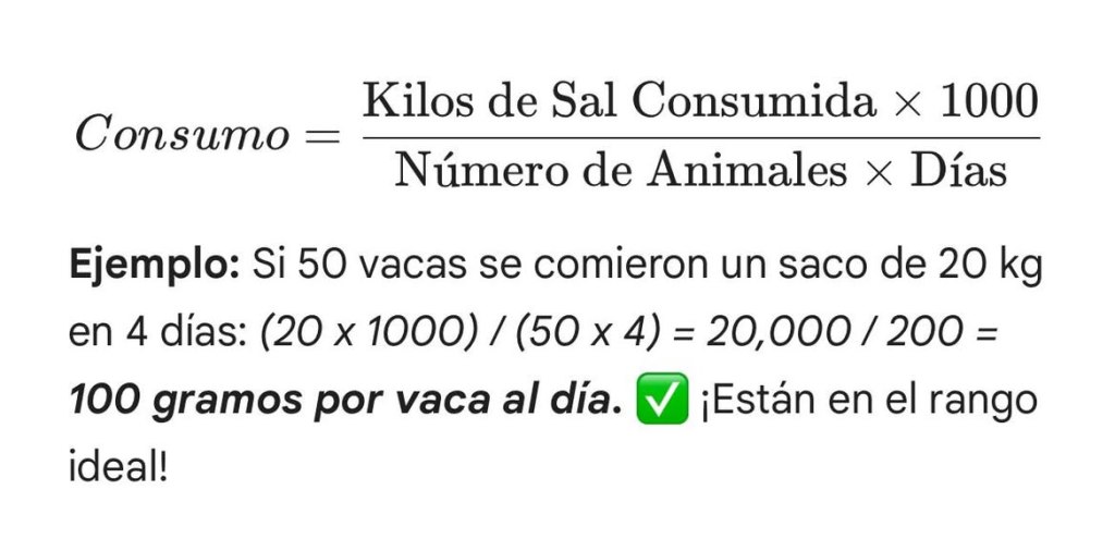El consumo depende del peso del animal, la etapa (lactancia/gestación) y la calidad del pasto, pero aquí tienes una regla general para sales mineralizadas comerciales: